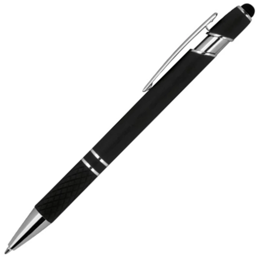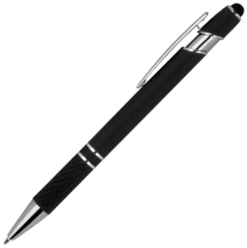 Fém golyóstoll, gumis felülettel és érintőképernyős funkcióval, kék tollbetéttel.