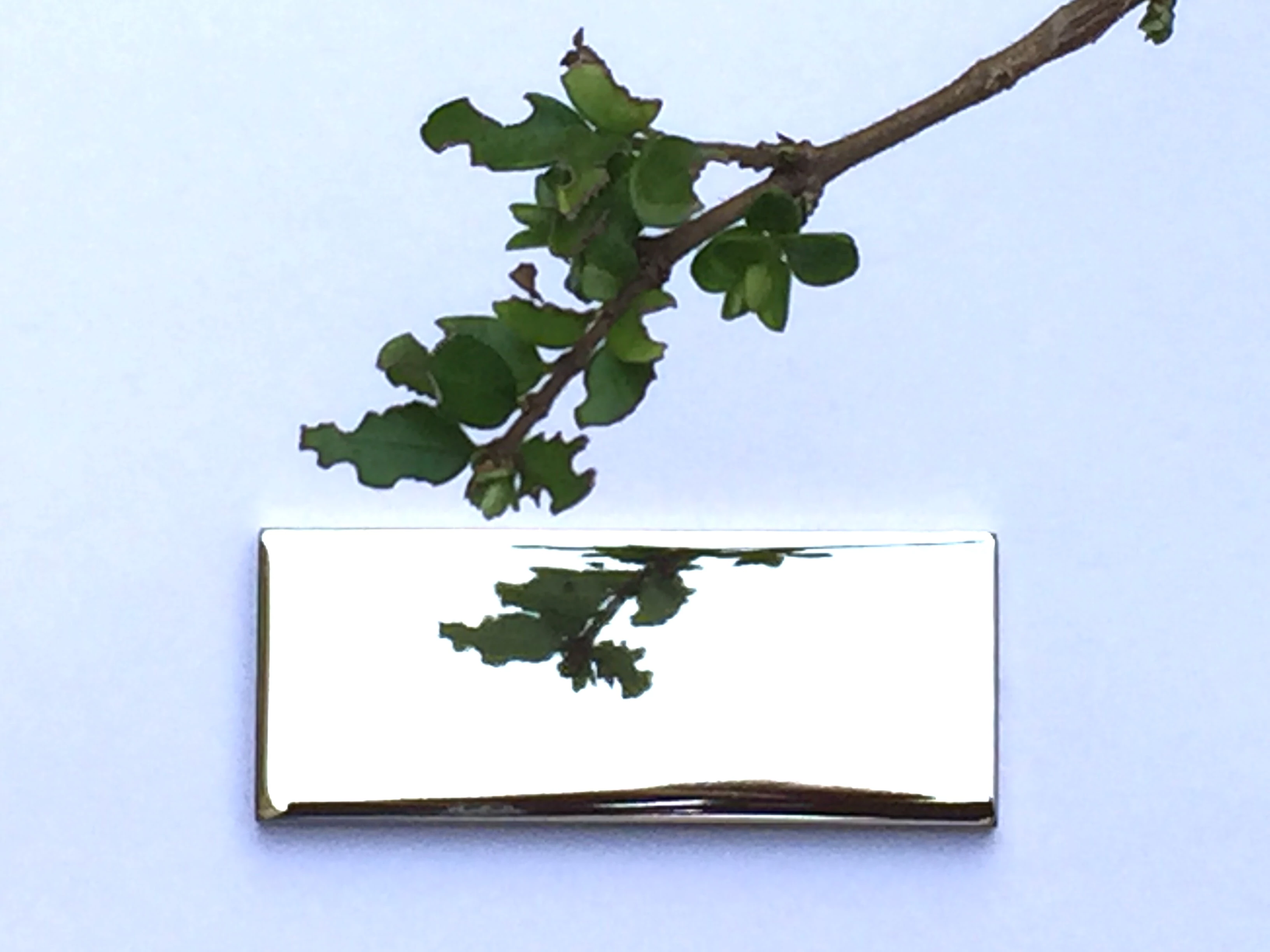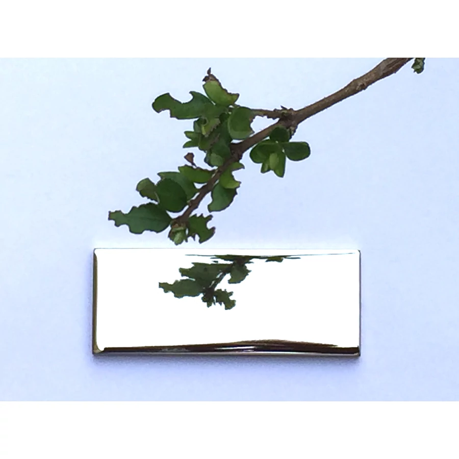 Fényes, tükrös felületű nikkelezett fém lap. Gravírozható, öntapadós kivitelben.