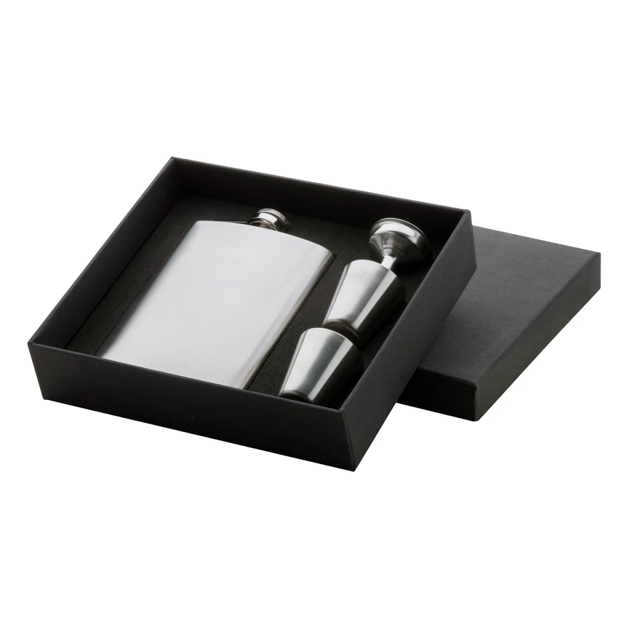 Rozsdamentes acél flaska 178 ml-es űrtartalommal, 2 darab egyenként 45 ml űrtartalmú röviditalos kupicával és tölcsérrel.