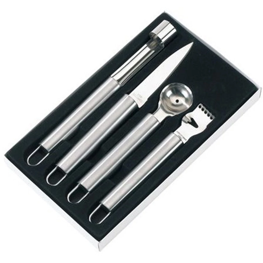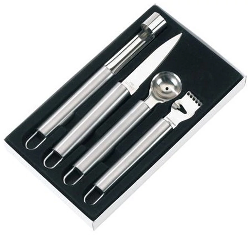 Gyümölcs késkészlet, tartalmaz egy narancshámozó kést, egy citromreszelőt, gyümölcsvelőkanalat, egy almamagházeltávolító kést.