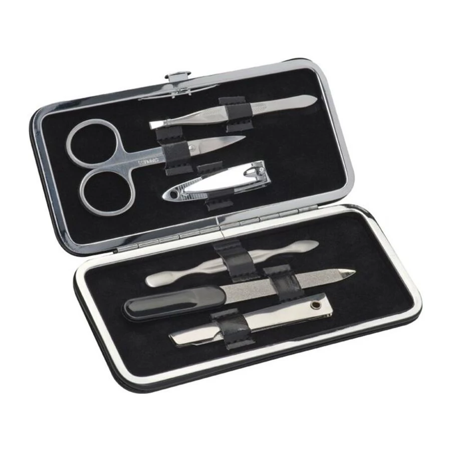 Hat darabos manikűrkészlet, rozsdamentes acélból, elegáns tartóban.