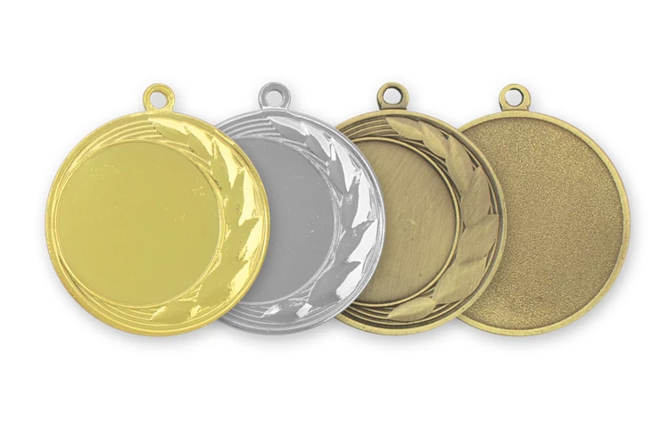 Ezüst színű kerek érem, levél mintával. A közepe jól gravírozható.