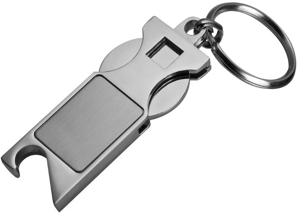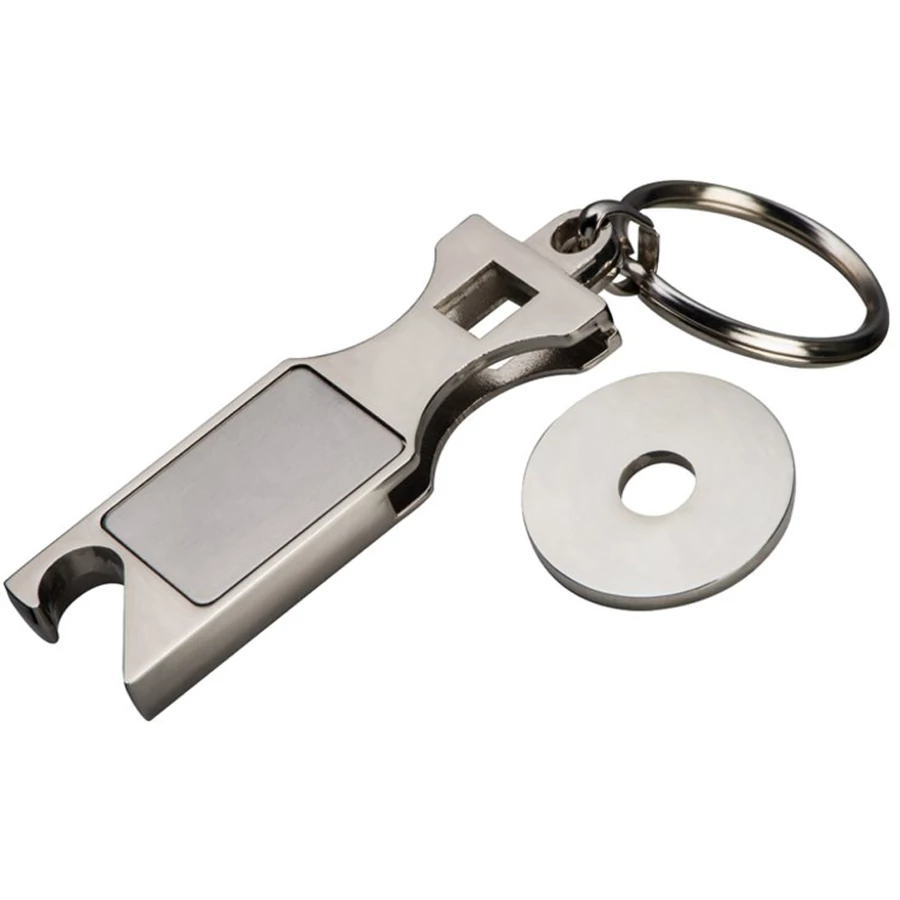 Praktikus kulcstartó, bevásárlókocsi érmével és sörnyitóval.