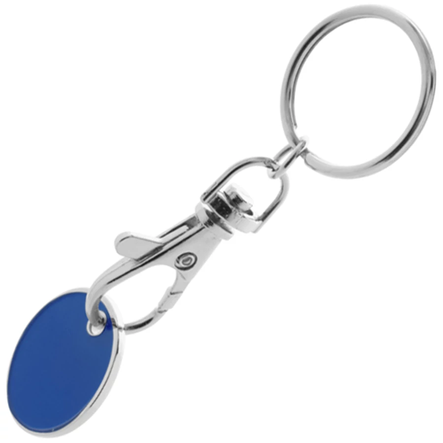 Kulcstartós bevásárlókocsi érme az egyik oldalán kék festéssel.