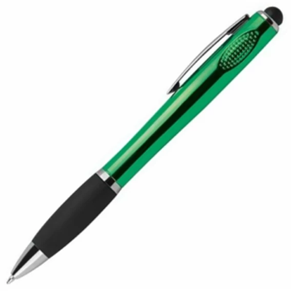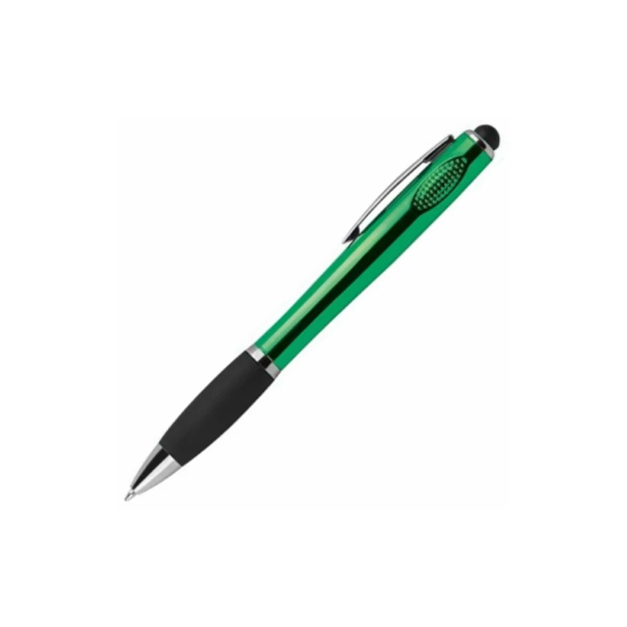 Műanyag érintőképernyős golyóstoll gumi markolattal, színes érintőgombbal és fehér LED-es fénnyel, ami a gravírozást követően világít.