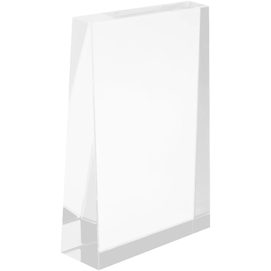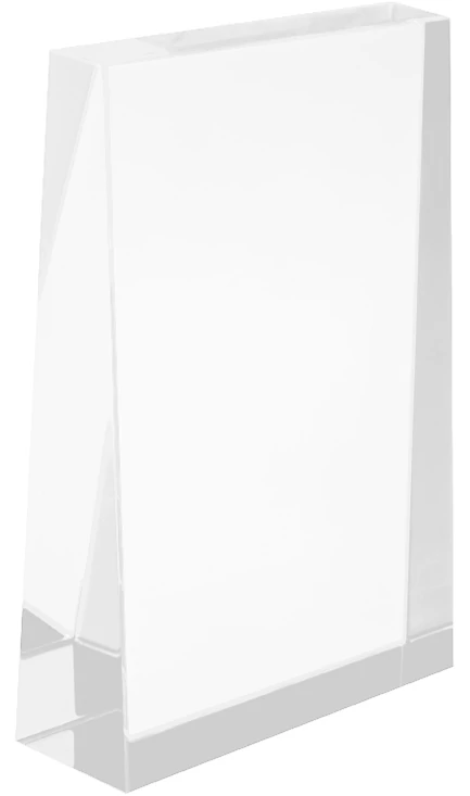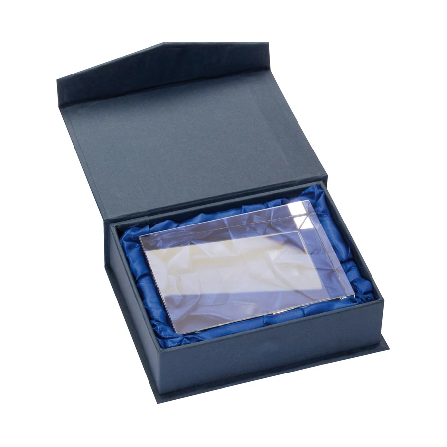 Átlátszó üveg plakett, nagy gravírozható felülettel. A díszdoboz amelybe csomagolták sötétkék és selyemmel bélelt.