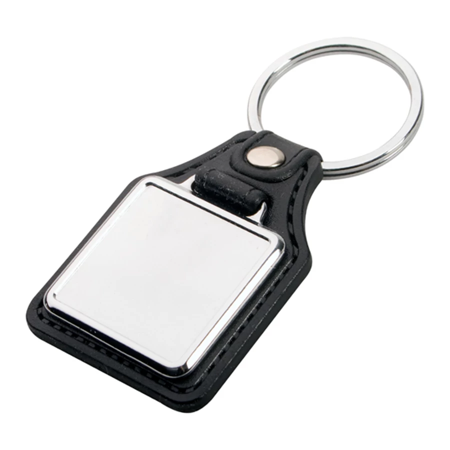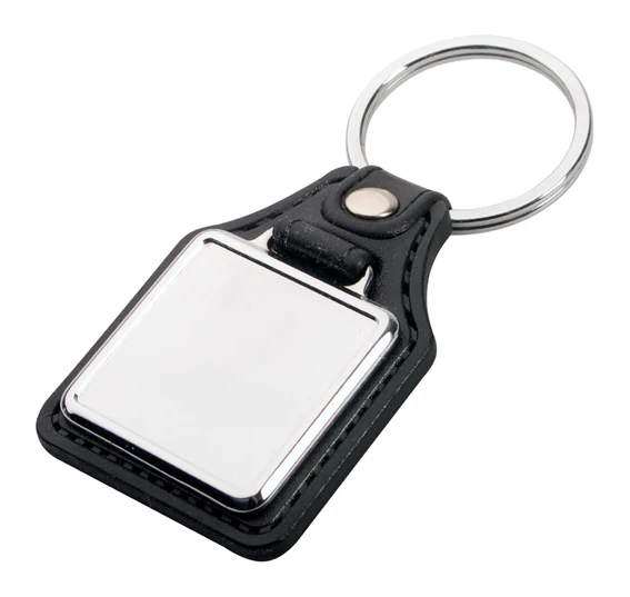 Négyzet alakú, fekete műbőr kulcstartó fém kiegészítővel és karikával.